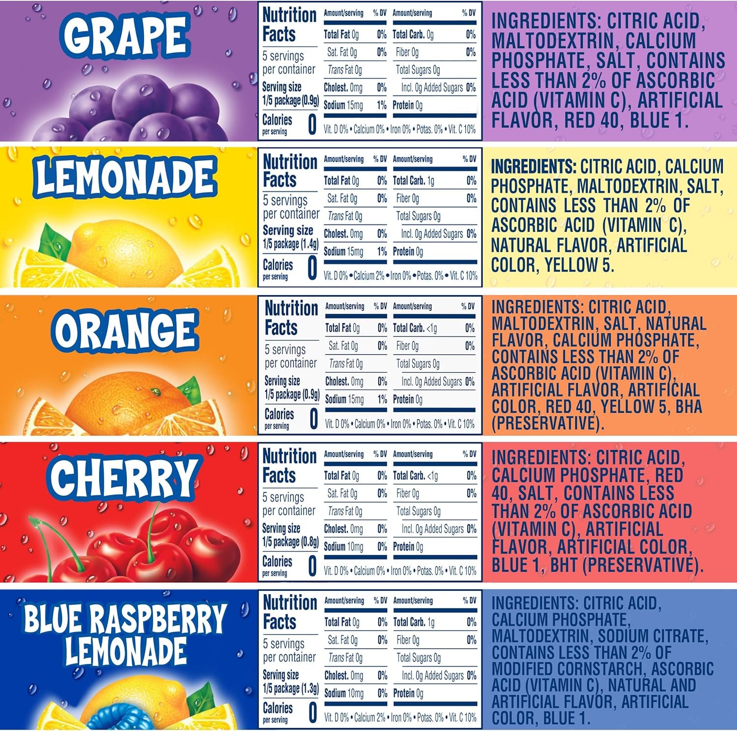 Kool-Aid Artificially Flavored Unsweetened Powdered Drink Mix Variety Pack is a delicious way to stay hydrated. This unsweetened powdered drink 50 count variety pack contains grape, lemonade, orange, cherry, and tropical punch flavors with 10 packets of each flavor. Just mix it with water and sugar or your sweetener of choice. Quench your thirst with the refreshingly sweet taste of grape, lemonade, orange, cherry, or tropical punch. With no caffeine, this artificially flavored powdered drink mix is always a great choice for the whole family. These handy packets of unsweetened drink ensure that you always have a refreshing beverage ready-to-go. To prepare, empty contents of one 0.14 ounce drink mix packet into a plastic or glass pitcher. Add 1 cup of sugar or sweetener. Then, just add ice and water and stir for a 2 quart supply of tasty Kool-Aid.